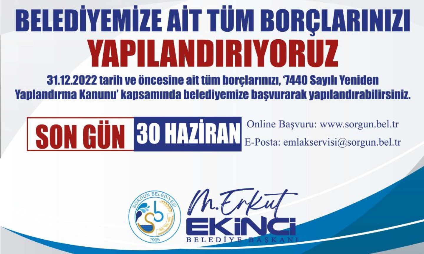 7440 sayılı vergi ücret ve benzeri alacakların yapılandırılmasına ilişkin kanun Türkiye Büyük Millet Meclisi tarafından kabul edilerek yasalaştı. Kabul edilen bu kanun çerçevesinde belediyemizin mükellefleri de kapsam içerisinde yer almaktadır. Belediyemiz mükelleflerinden belediyeye borcu olan ilan reklam vergisi, eğlence vergisi ve benzeri vergilerle, ücret, resim, harç gibi alacaklar bu kamsampa. Ayrıca kira alacakları, idari para cezaları ve benzerleri özelliklede harcamalara katılım paylarıda kapsam içerisinde. Mükelleflerimiz 30 Haziran 2023 tarihine kadar online olarak yada bizzat kendileri belediyemize başvurabilirler. Yapılandırma kapsamında dilekçesini aldığımız mükelleflere 48 aya kadar eşit aylık taksitler halinde ödeme imkanı sağlayabiliyoruz. Online başvuru yapmak için ekte bulunan evrakı doldurarak; emlakservisi@sorgun.bel.tr e-posta edresine yollalabilirsiniz.