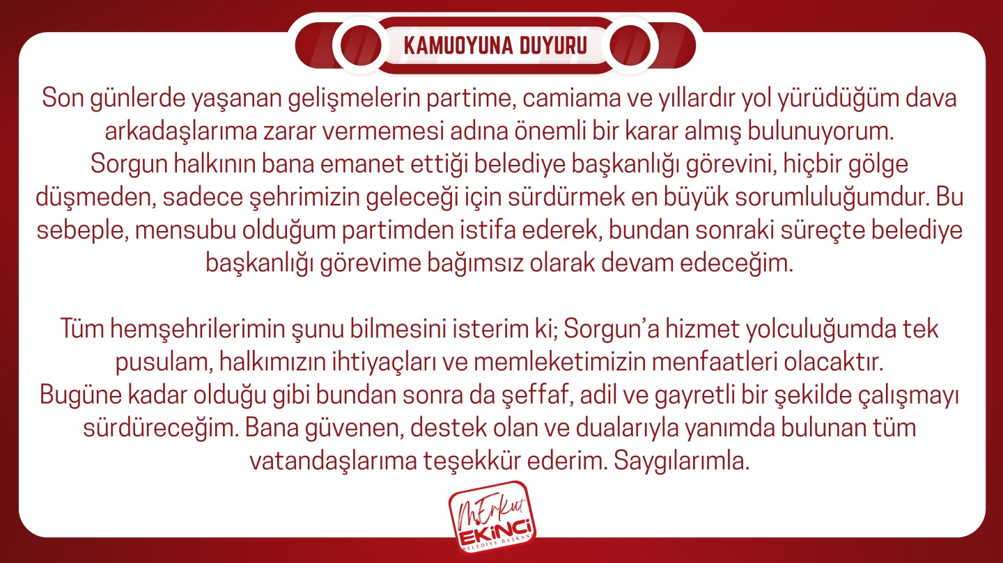 Sorgun halkının bana emanet ettiği belediye başkanlığı görevini, hiçbir gölge düşmeden, sadece şehrimizin geleceği için sürdürmek en büyük sorumluluğumdur. Bu sebeple, mensubu olduğum partimden istifa ederek, bundan sonraki süreçte belediye başkanlığı görevime bağımsız olarak devam edeceğim.