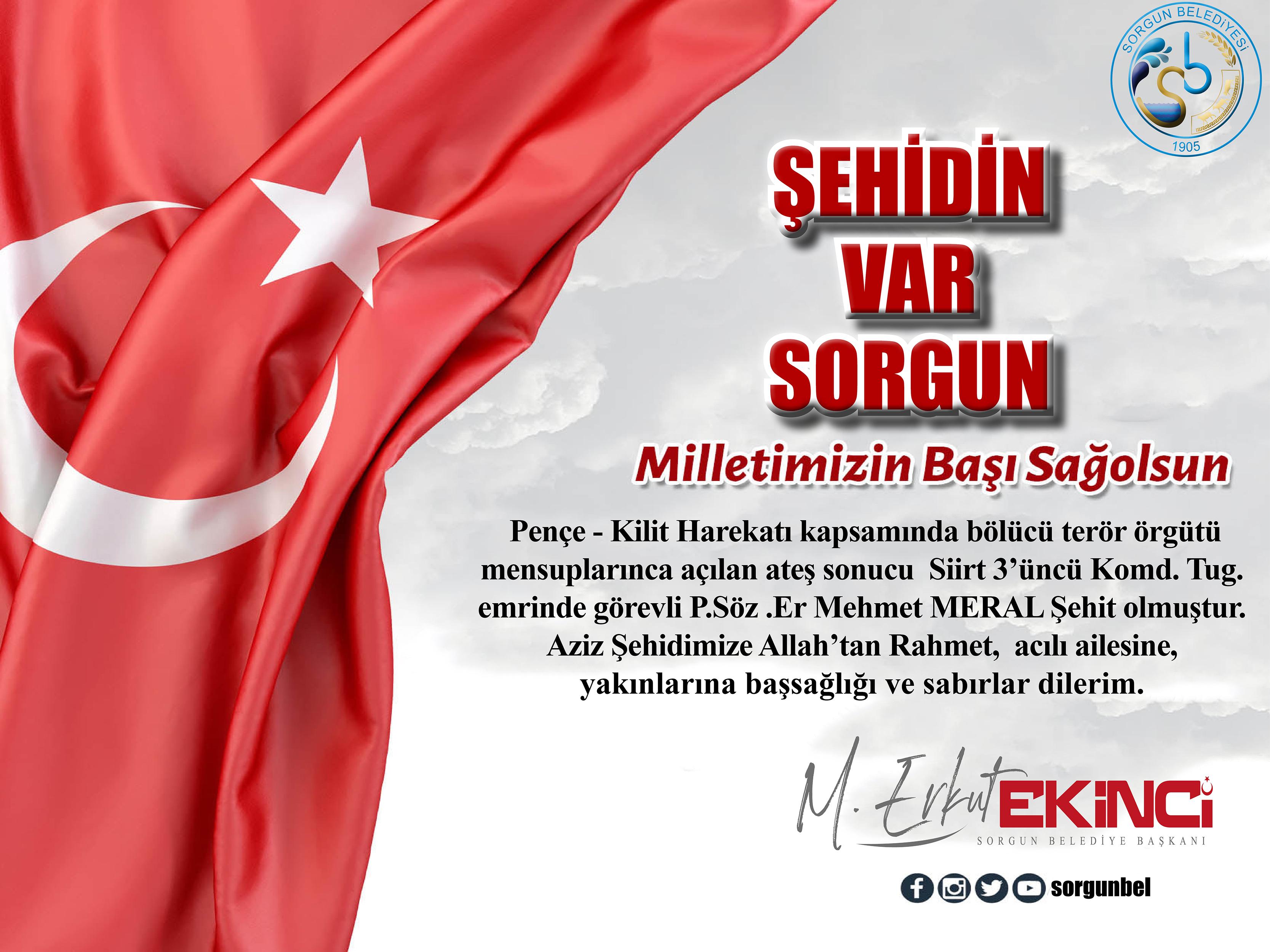 Pençe - Kilit Harekatı kapsamında bölücü terör örgütü mensuplarınca açılan ateş sonucu Siirt 3’üncü Komd. Tug. emrinde görevli ilçemiz Küçük Taşlık Köyünden P.Söz .Er Mehmet MERAL Şehit olmuştur.