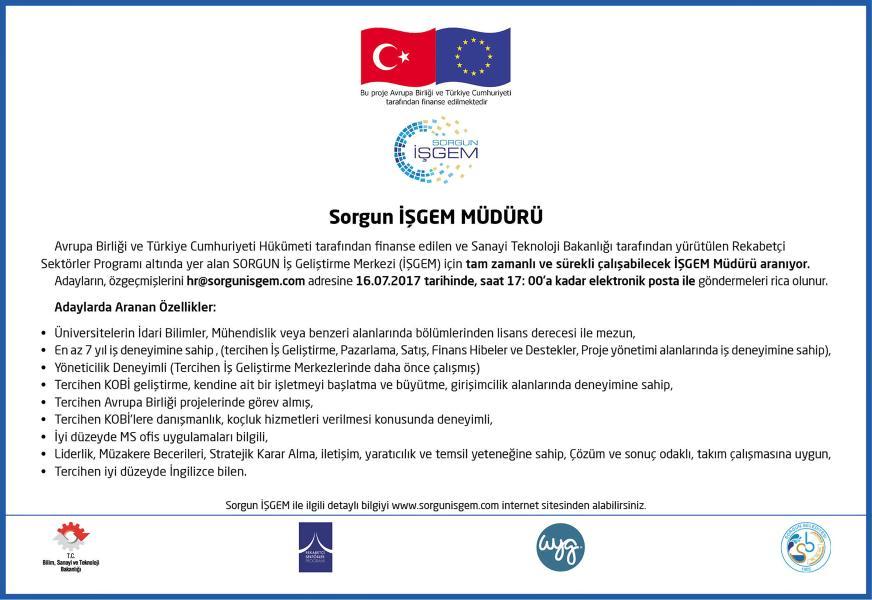 Avrupa Birliği ve Türkiye Cumhuriyeti Hükümeti tarafından finanse edilen ve Sanayi Teknoloji Bakanlığı tarafından yürütülen Rekabetçi Sektörler Programı altında yer alan SORGUN İş Geliştirme Merkezi (İŞGEM) için tam zamanlı ve sürekli çalışabilecek İŞGEM Müdürü aranıyor.